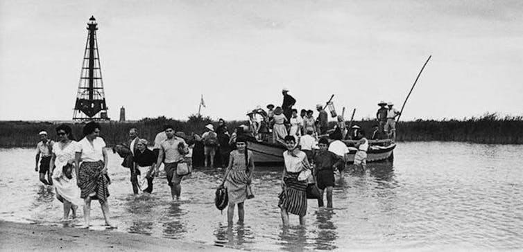 Hoy ese faro está casi 3 km mar adentro. Fue construido en tierra en 1864. Cada año el mar le gana unos metros al delta y hoy apenas se le distingue en el horizonte.