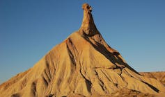 El Castildetierra (Bardenas Reales) es un paisaje creado por la erosión de sedimentos de distinta dureza acumulados en la cuenca sedimentaria del Ebro hace entre 50 y 10 millones de años. Los estratos más duros que protegen estos montículos de la erosión son rocas calcáreas que se forman en el fondo de lagos.Yurki/Wikimedia Commons, CC BY-SA