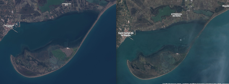 Fotografías satelitales (Sentinel) antes (izquierda) y después (derecha) del paso de la tormenta Gloria. A la derecha se ve el lóbulo sur del Delta convertido en una nueva isla. Sentinel (ESA)