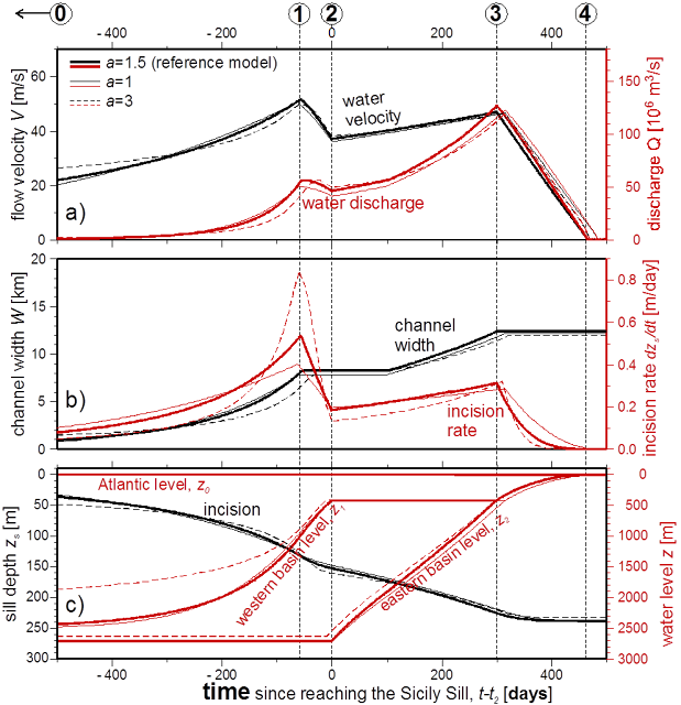 Possible evolution of the flood derived from the model. The lower panel shows the evolution of the seaway depth as it is eroded by the increasing flow of water (black lines, left scale) and the rising Mediterranean level (red lines). From our article in Nature.